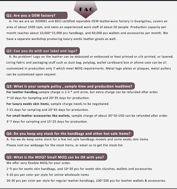 We own a separate workshop of about 20 people and a sampling room of 5 people, 3 engineers and 2 super experienced technicians. This workshop is for production only for real exotic leather goods, such as bags, belts, wallets and small accessories. Most of the exotic skins are available say crocodile skin(caiman, siam, alligator, prosus), ostrich skin (from south africa), python skin, lizard skin,stingray skin, snake skin, deer skin, sharkskin, eel skin, fish skin etc.