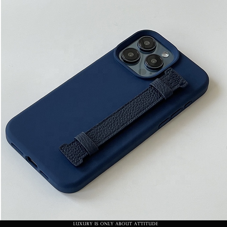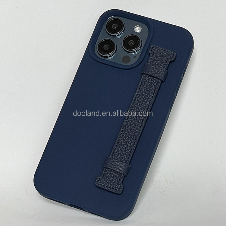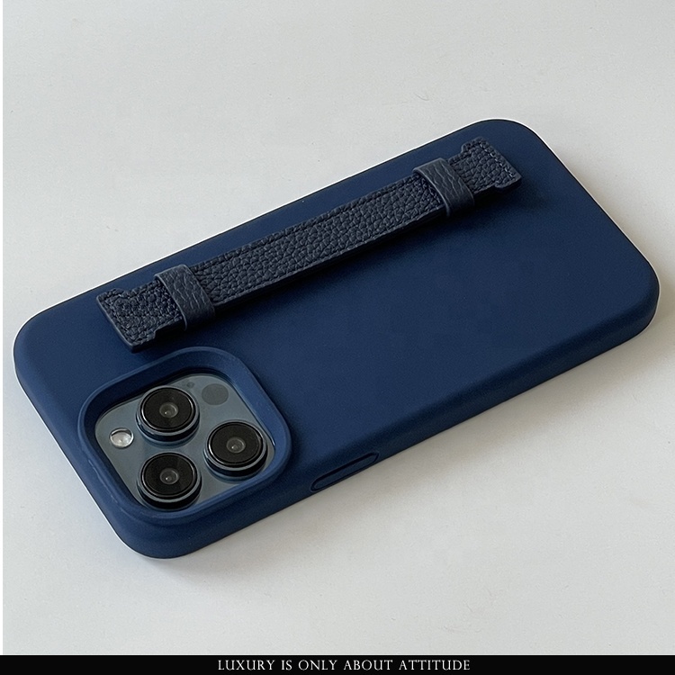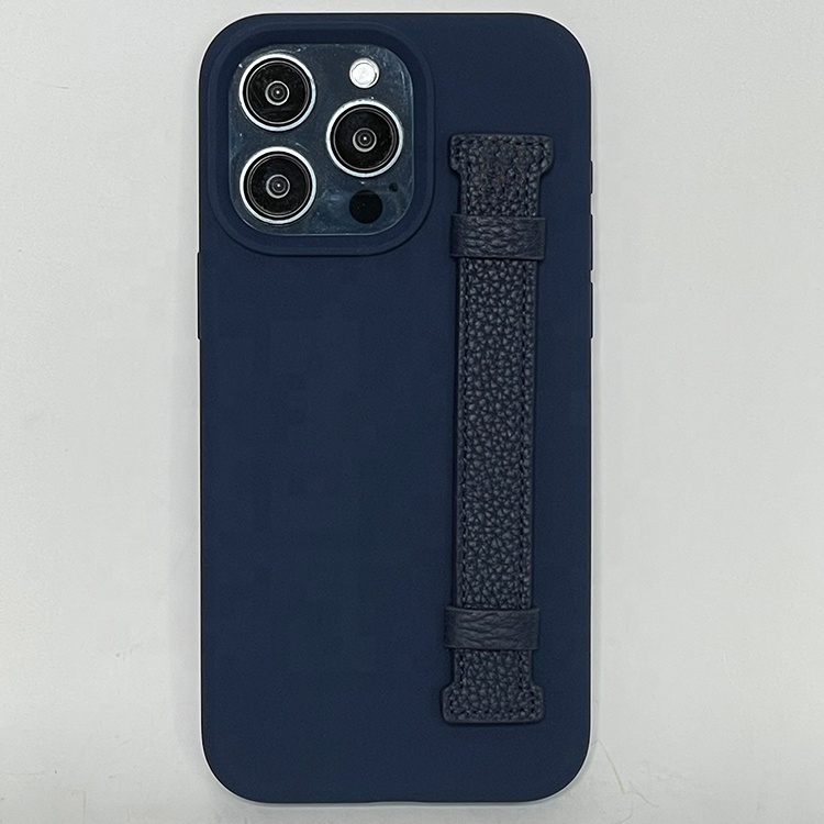 Hot selling high quality silicone phone case with leather finger strap for iphone 12 13 14 15 pro max